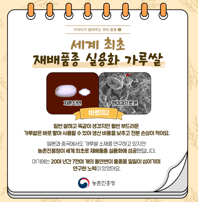 일본, 중국에서도 가루쌀 소재에 대해 연구했지만, 농촌진흥청에서 20여 년간 연구 끝에 세계 최초로 재배품종으로 실용화했다는 점도 기억해 주면 좋을 것 같습니다.