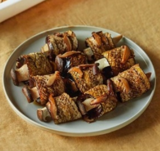 4. 전자레인지에서 익힌 가지애 새송이버섯을 넣고 돌돌 말아줍니다.