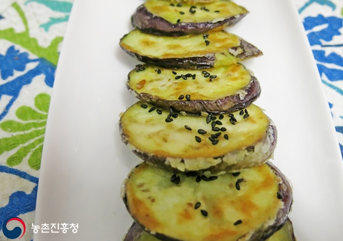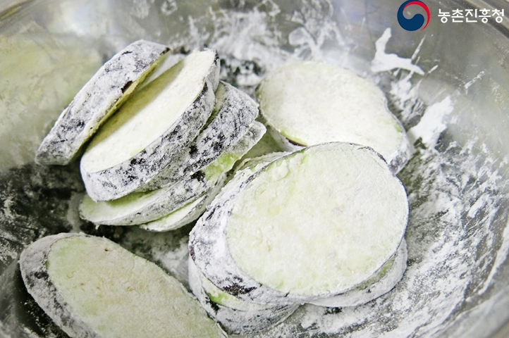 어슷 썬 가지에 밀가루 옷을 입혀 기름 두른 팬에 노릇노릇 구워 양념장에 찍어 먹으면 진짜 맛있습니다.