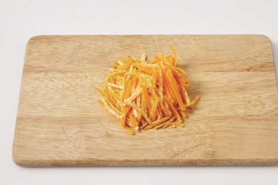 1. 귤껍질은 베이킹소다로 깨끗이 씻은 뒤 안쪽의 흰 부분을 제거하고 채 썰어줍니다.