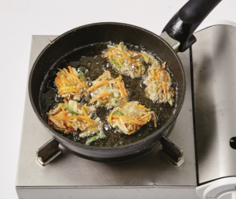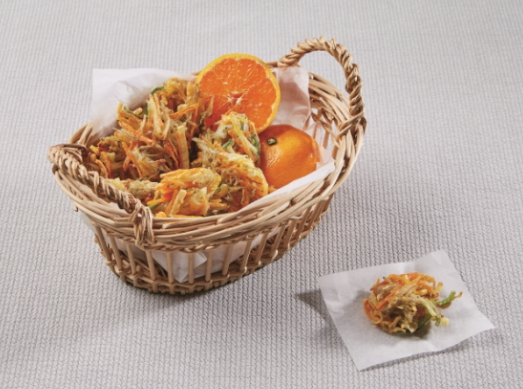 새콤달콤한 과즙으로 즐기는 감귤 대신, 바삭한 맛을 즐길 수 있는 이색 메뉴입니다. 채 썰은 귤껍질에 잔멸치, 감자, 당근, 피망을 더해 튀겨서 만들어집니다.