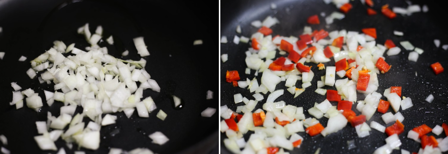 1. 기름을 두른 팬에 다진 양파, 다진 파프리카를 넣고 볶아줍니다.