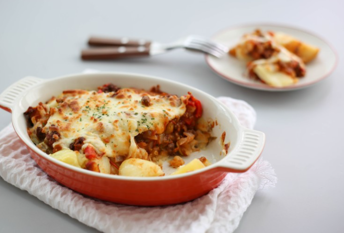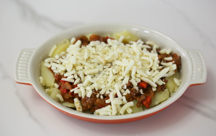 4. 그라탕 용기에 삶은 감자, 토마토 비프 소스, 모짜렐라 치즈 순으로 얹어줍니다.