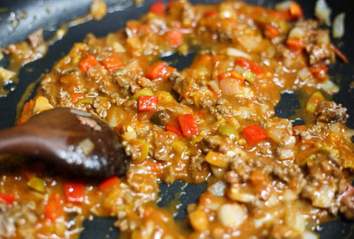감자 4개, 양파 30g, 파프리카 60g, 다진 소고기 90g, 토마토소스 400g, 모짜렐라 치즈, 소금, 후추