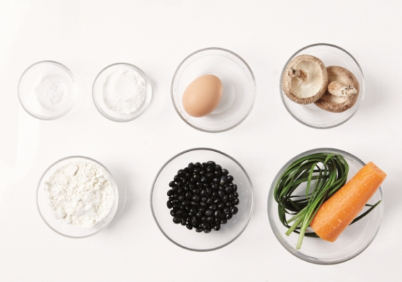 검은콩 2/3컵, 표고버섯 2개, 당근 1/5개, 부추 3대, 소금 약간, 달걀 1개, 밀가루 1/2컵, 찹쌀가루 3큰술, 식용유 약간