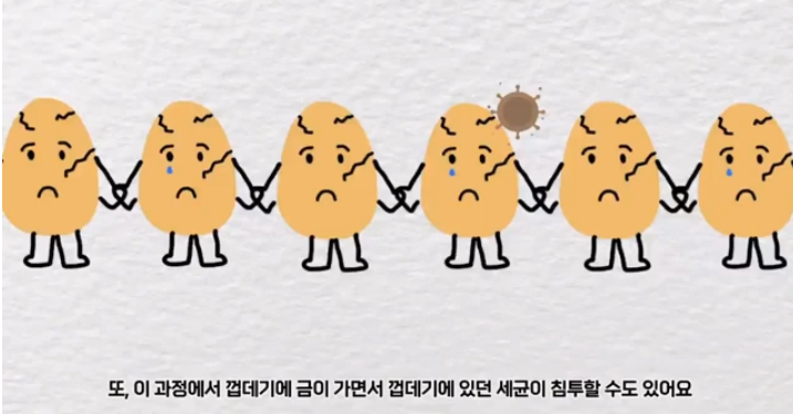 또, 이 과정에서 껍데기에 금이 가면서 껍데기에 있던 세균이 침투할 수도 있습니다.