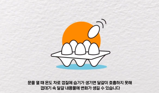 문을 열 때도 온도 차로 껍질에 습기가 생기면 달걀이 호흡하지 못해 껍데기 속 달걀 내용물에 변화가 생길 수 있습니다.