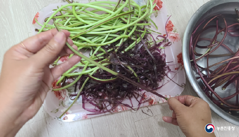 '생고구마 순'은 껍질을 벗겨 소금물에 데쳐 찬물에 헹군 뒤 물기를 빼고 조리에 이용하면되고, '건고구마 순'은 물에 불려 데친 후 조리에 이용하면 됩니다.