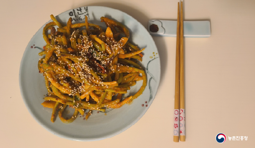8. 잘 버무려진 고구마줄기 김치를 예쁜 그릇에 담아 통깨를 뿌려 식탁에 올립니다.