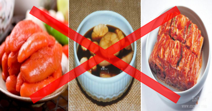 김치, 젓갈류, 장아찌, 된장, 고추장, 베이컨, 햄, 마가린, 마요네즈