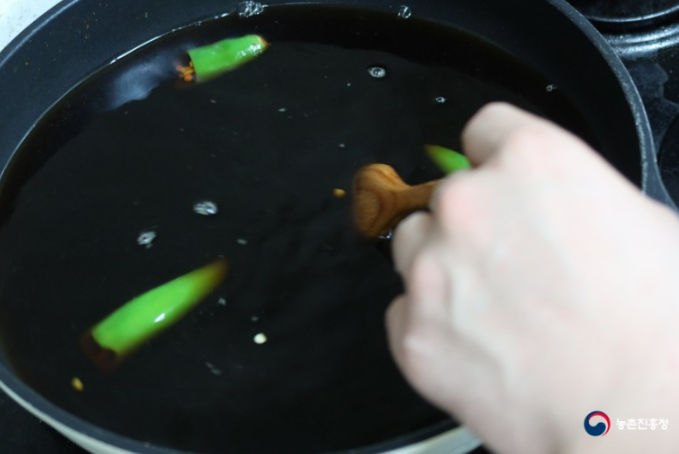 7. 간장 물을 다 부었으면, ④에서 준비해 둔 청양고추와 홍고추를 위에 뿌려줍니다.