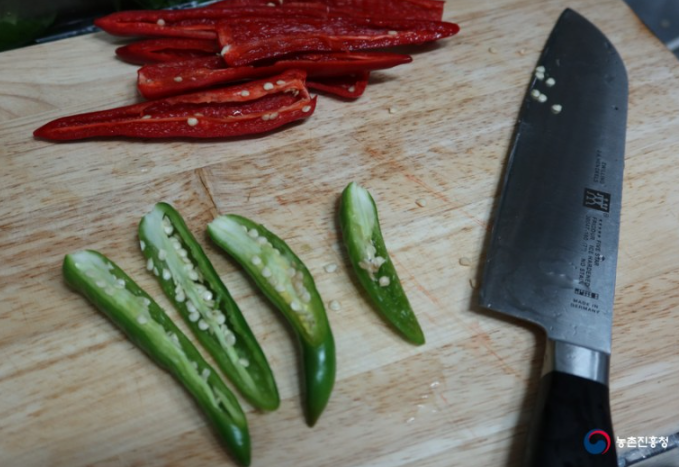 4. 다시마 육수가 끓는 동안에 장아찌의 색감을 내줄 홍고추와 매콤한 맛을 내줄 청양고추를 다듬어 주는데, 고추씨는 다 빼서 종종 썰어서 준비해 줍니다.