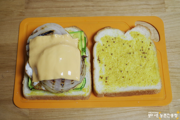 애호박 위로 계란프라이  양파 치즈 순으로 올려준 후 다른 면의 식빵을 덮어줍니다.