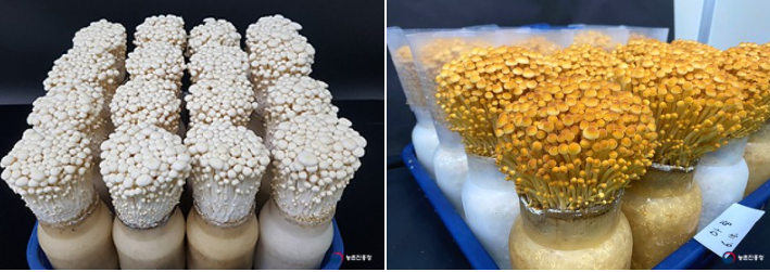 그중, 흰색 팽이 '백승'은 대의 중앙 부위가 단단하고, 균일하게 자라는 특징이 있다고 합니다. 황금색 팽이 '아람'은 갓 색이 황금색을 띠고 아래로 갈수록 연한 갈색으로 아주 예쁜 색을 가졌다고 합니다. 우수한 품종 개발과 적극적인 보급으로 2020년 국산 품종 비율이 31.6%까지 높아졌다고 합니다. 앞으로도 더 늘어나길 기대해 봅니다.