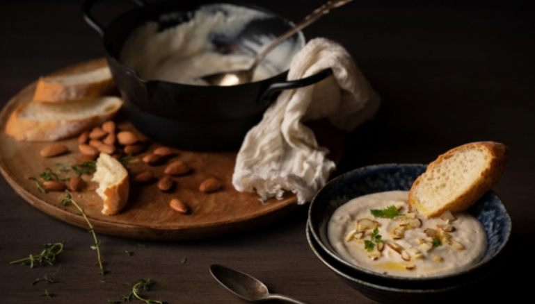 먼저 아몬드를 12시간에서 24시간 정도 물에 불린 후 껍질을 벗겨줍니다. 준비된 아몬드를 아몬드 밀크 200mℓ에 넣고 소금 1티스푼, 올리브유 3티스푼을 넣어 끓여줍니다. 이후 내용물을 믹서기로 갈아주면 완성된다고 합니다. 여기에 아몬드 분태를 뿌려주면 오도독 씹히는 식감까지 즐길 수 있다고 합니다. 취향에 맞게 바게트나 구운 식빵을 곁들여 먹어도 좋다고 합니다.