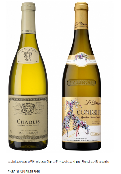 고급 와인 중에서는 일명 '인건희(故 삼성그룹 선대회장) 와인'으로 유명해진 'E.기갈 꽁드리유 라 도리안'이 손꼽힙니다. 와인앤모어 관계자는 "E.기갈 꽁드리유 라 도리안은 프랑스산 오크통에서 숙성시켜 부드러운 산미와 바디감을 지닌 와인으로, 생굴은 물론 게, 킹크랩과도 잘 어울린다"라고 말했습니다.