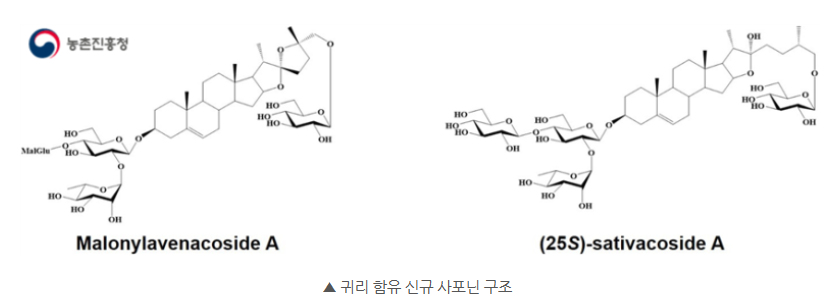 22종의 사포닌 배당체 중 말로닐아베나코사이드 에이(malonylavenacoside A), 사티바코사이드 에이(sativacoside A) 등 7종은 국내 귀리에서 세계 최초로 확인됐다고 합니다.