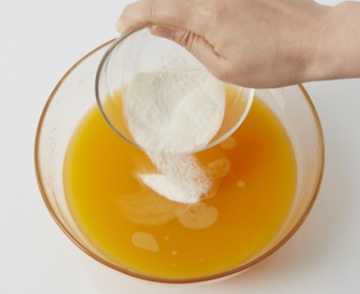 3. 귤즙에 한천가루를 넣어 10~15분간 불립니다.