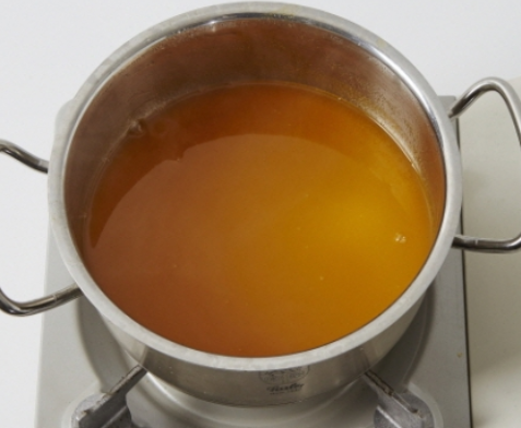 4. 냄비에 귤즙, 설탕, 물엿을 넣고 끓어오르면 중약 불로 줄여 저어가며 20분간 끓입니다.