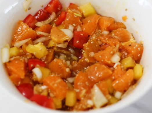 귤 550g, 파프리카 100g, 다진 양파 10g, 바게트, 오리엔탈 풍 소스(간장 0.5큰술, 올리브유 2큰술, 올리고당 1큰술, 통깨, 후추)