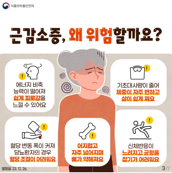 근육은 30세부터 줄어들어 50세부터는 매년 1~2% 손실되고, 70대가 되면 절반으로 줄어들어 노인기에 각별한 주의가 필요합니다.