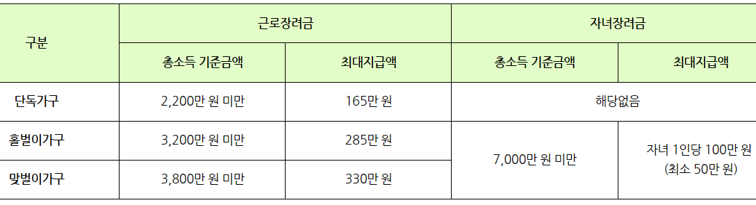 장려금 신청은 1가구 당 1명만 신청이 가능합니다. 근로, 사업, 종교인 소득이 있는 거주자로서 아래 요건이 모두 충족되어야 합니다.