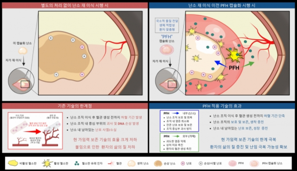 분당서울대병원(원장 송정한) 산부인과 이정렬 교수, 서울대 융합과학 기술대학원 이강원 교수, 분당차병원 김지향 교수 공동 연구팀(제1저자:정나눔 박사과정)이 자가 혈소판 유래 인자를 캡슐화한 피브린 하이드로겔(PFJ, Platelet-drived Factors-Encapsulated Fibrin Hydrogel)을 개발하고, 비임상 시험을 통해 PFH가 난소 이식 후 허혈 손상 완화와 난소 기증 보존에 효과적임을 입증하는 연구 결과를 10월 30일 발표했다고 합니다.