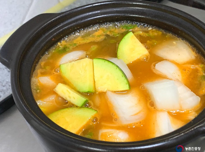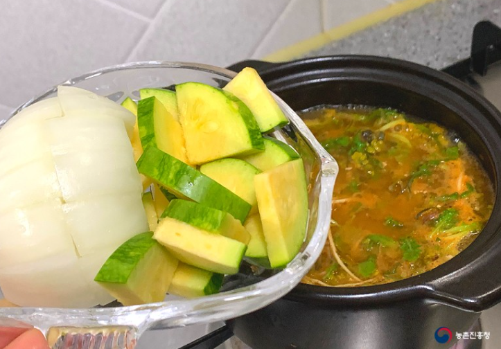3. 세척한 냉이 100g를 먼저 넣고 끓이다가, 숨이 죽으면 썰어둔 양파(반조각)와 애호박(1/3)을 넣고 익을 때까지 보글보글 끓여주면 끝입니다.