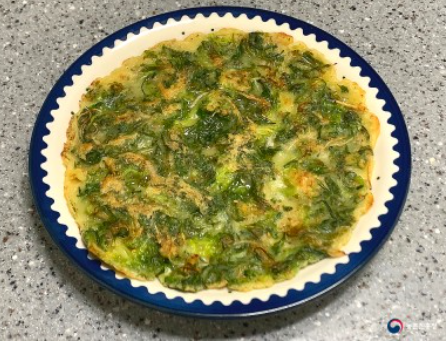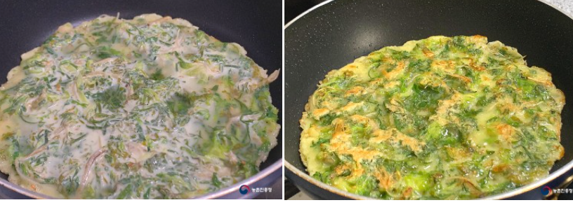 4. 프라이팬에 그름을 두르고 냉이전 반죽을 얇게 펴 천천히 익혀줍니다. 반죽 색깔이 전체적으로 변했을 때 뒤집개를 이용해 뒤집어 줍니다.