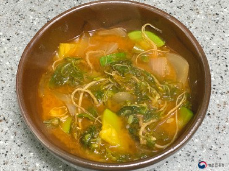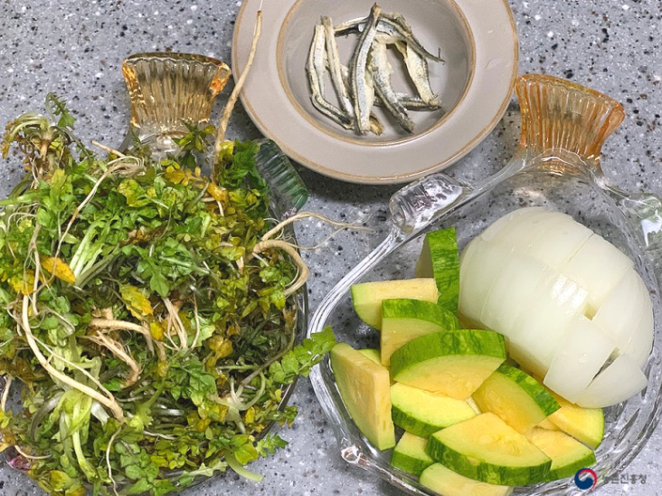냉이 100g, 물 500ml, 명치 4~5마리, 양파 반 조각, 애호박 1/3, 된장 2큰술, 고추장 1큰술, 청양고추 1/3