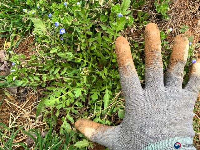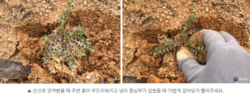 부드러운 흙에 사는 냉이는 손으로도 쉽게 뽑을 수 있지만 단단한 땅에서 캘 때는 호미를 이용하는 것이 좋다고 합니다. 힘으로 뽑았다가는 잎만 뜯어질 수 있다고 합니다.