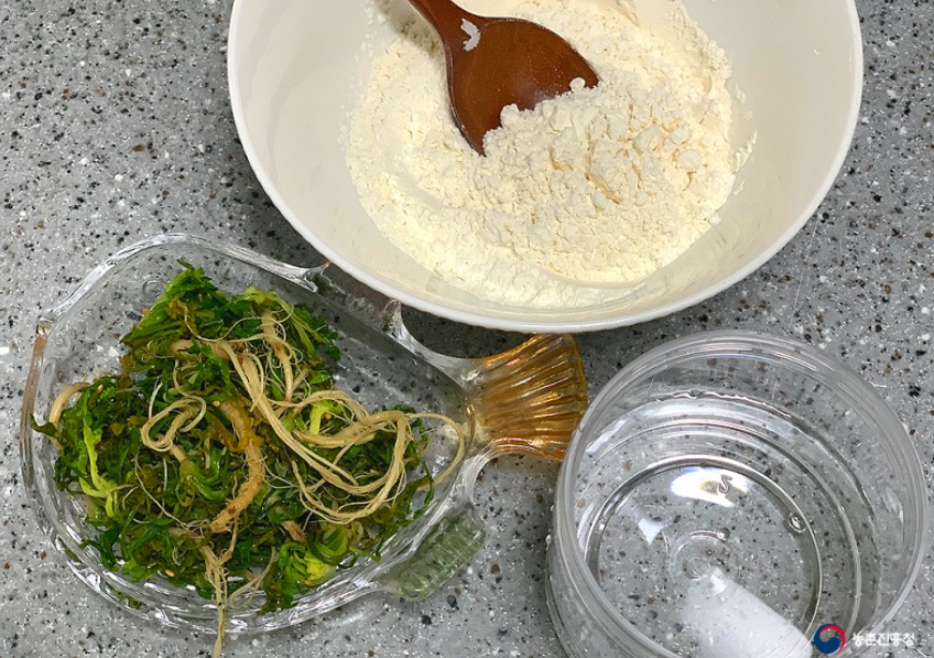 냉이 100g, 부침가루 50g, 물(500mg, 200mg), 소금 약간