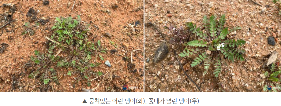 위의 사진은 왼쪽은 이미 꽃 핀 냉이이고, 오른쪽은 너무 큰 냉이입니다.