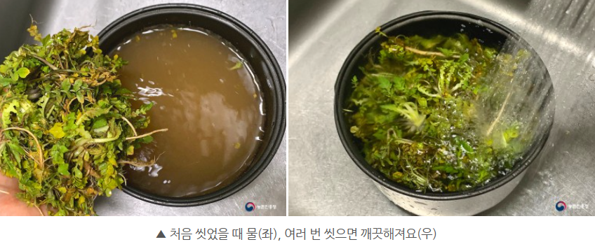 잎과 뿌리 사이사이에 흙이 끼어있기 쉽고, 뭉쳐 있으면 잘 씻기지 않기 때문에 쌀 씻듯이 손으로 휘저어 주는 것이 포인입니다.