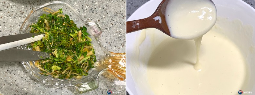 1. 끓는 물 500g에 5분 정도 냉이를 데쳐, 소금을 약간 넣고 가볍게 무쳐줍니다. 그다음, 가위로 먹기 좋게 잘라줍니다.