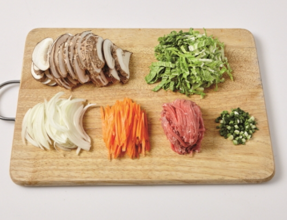 1. 표고버섯, 봄동, 양파, 당근, 소고기는 채 썰고, 쪽파는 송송 썰어줍니다.