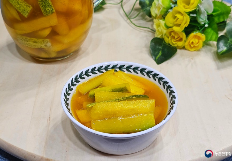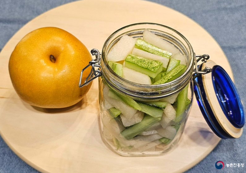 치자를 우려 넣었더니 배와 오이가 고운 노란색으로 물들어 예쁩니다. 기름기가 많은 명절 음식인 전, 잡채 등과 함께 올리면 새콤달콤 입맛을 제대로 살려줄 것입니다.
