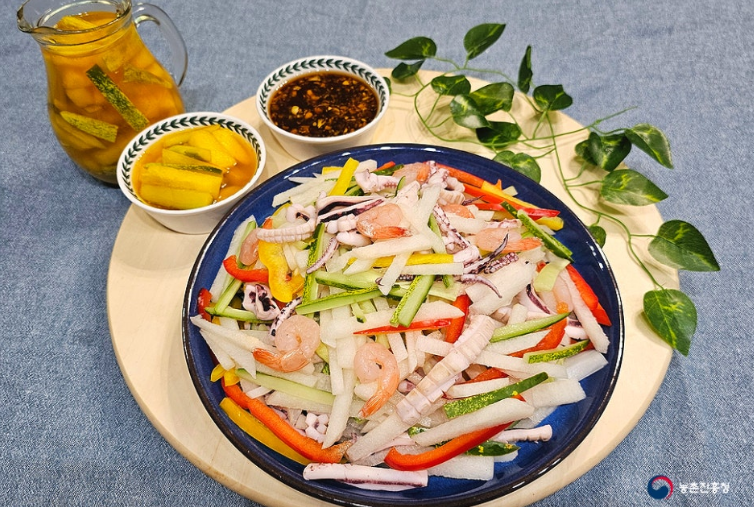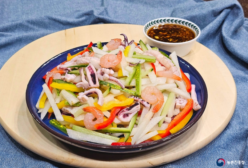 Tip : 오징어, 새우 대신 해파리, 전복 등 다른 해산물을 데쳐 함께 버무려도 좋습니다.