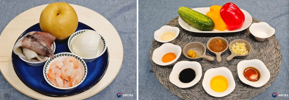 배 1개, 양파 1/2개, 오징어 1마리, 칵테일새우 10마리, 오이 1개, 빨간 파프리카 1/2개, 노랑 파프리카 1/2개, 양념 소금 1작은술, 유자 겨자 소스(식초 2큰술, 매실청 1큰술, 간장 2큰술, 다진 마늘 1작은술, 올리고당 1큰술, 연겨자 1작은술, 유자청 1큰술, 참기름 약간)