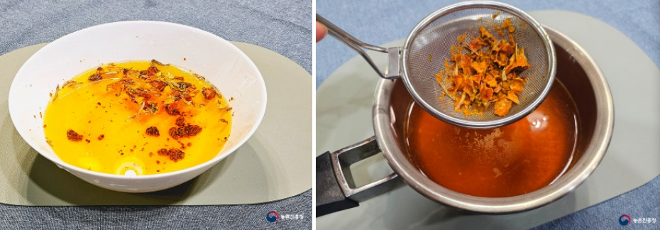 3. 치자 3개를 잘게 부숴 물에 30분가량 우려낸 뒤, 체에 걸러줍니다.
