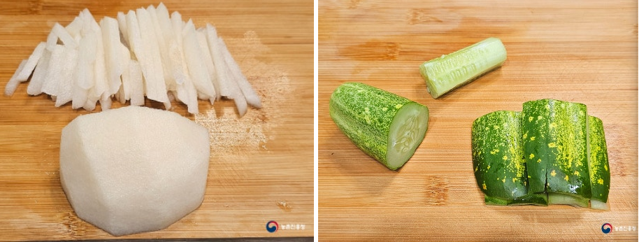 1. 배 1개는 껍질과 씨를 제거해 채 썰고, 오이 1개는 돌려 깎기로 씨를 뺀 다음 배와 비슷하게 채 썰어줍니다.