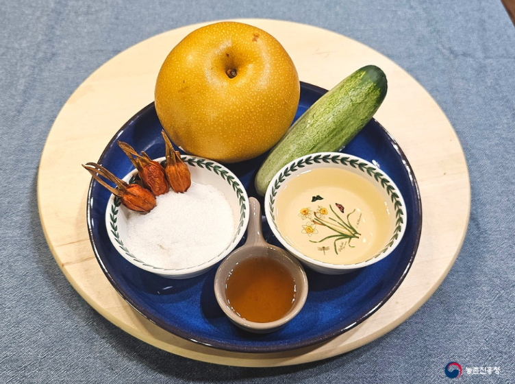 배 1개, 오이 1개, 치자 3개, 설탕 2/3컵, 식초 1/2컵, 매실청 2큰술