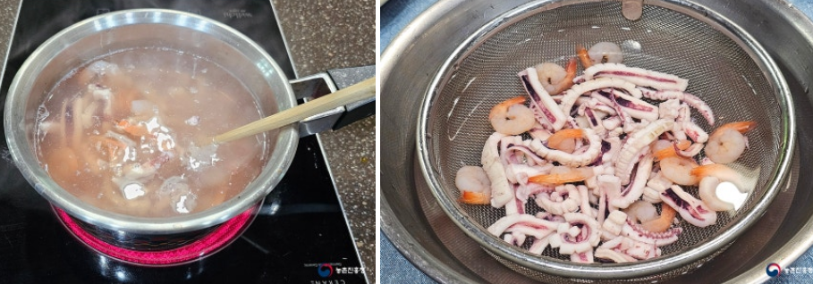 4. 물 5컵에 소금 1작은술을 넣어 팔팔 끓인 뒤, 오징어와 칵테일 새우 10마리를 4분간 데쳐 흐르는 물에 씻고 체에 밭쳐 한 김 식혀줍니다.