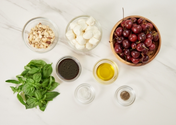 생 체리, 생 바질, 발사믹식초 2큰술, 흑후추와 소금 약간씩, 올리브 오일(엑스트라 버진) 1큰술, 구운 아몬드 반 컵, 생 모차렐라 치즈