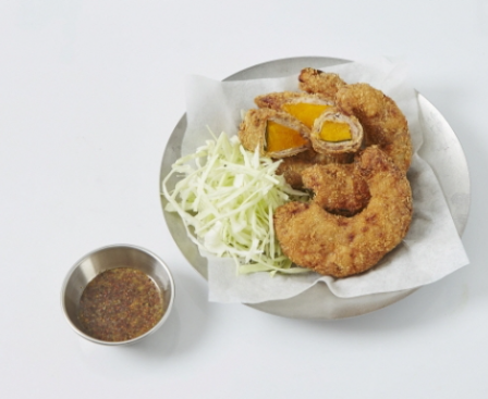오늘은 단호박을 고기에 활용한 '단호박 고기 튀김'입니다. 단호박을 대패삼겹살로 돌돌 말아 튀겨낸 메뉴인데, 바삭한 식감에 고소함과 달콤함이 더해진 요리입니다.