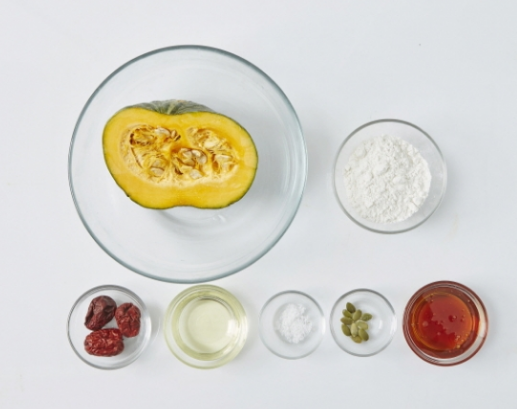 단호박 1/2통(300g), 찹쌀가루 1⅓컵, 소금 ¼t, 마른 대추 3개, 식용유 2T, 호박씨 10개, 조청 2T