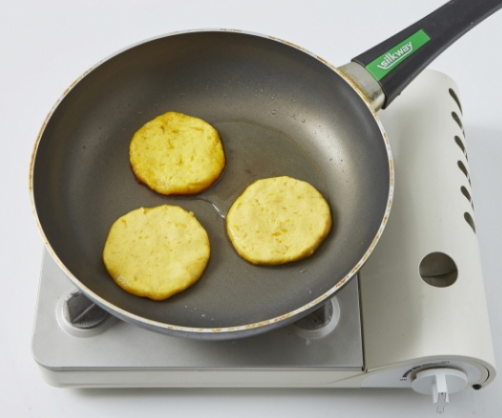 5. 중약 불로 달근 팬에 식용유 2T를 두른 뒤 반죽을 동글납작하게 빚어 얹고 앞뒤로 노릇하게 구워냅니다.