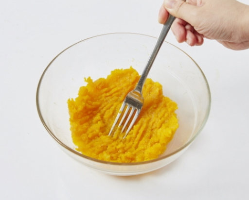 2. 볼에 단호박을 넣고 랩을 씌워 전자레인지에 5분간 익힌 뒤 뜨거울 때 으깨줍니다.