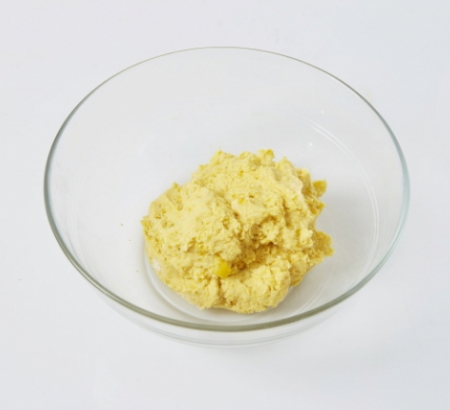 4. 으깬 단호박에 찹쌀가루 1⅓컵, 소금 ¼을 섞고 뜨거운 물2를 조금씩 부어가며 익반죽 합니다.