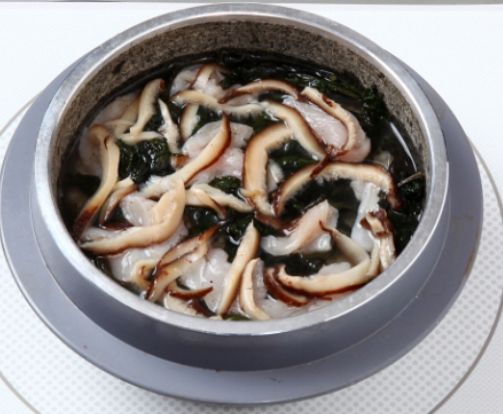 5. 돌솥 냄비에 불린 발아현미와 백미, 곤드레, 닭 가슴살, 표고버섯을 넣고 물을 부어 밥을 짓습니다.